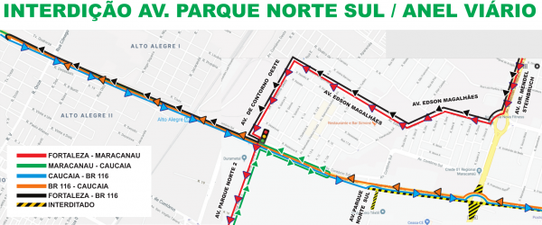 A partir desta quarta-feira (5), motoristas que trafegam pelo Anel Viário devem ficar atentos a um novo desvio de tráfego para acessar Maracanaú. A rua Parque Norte Sul, que dá acesso ao município, será interditada para a conclusão da duplicação do trecho entre a fábrica Durametal e a rotatória da CE-060.