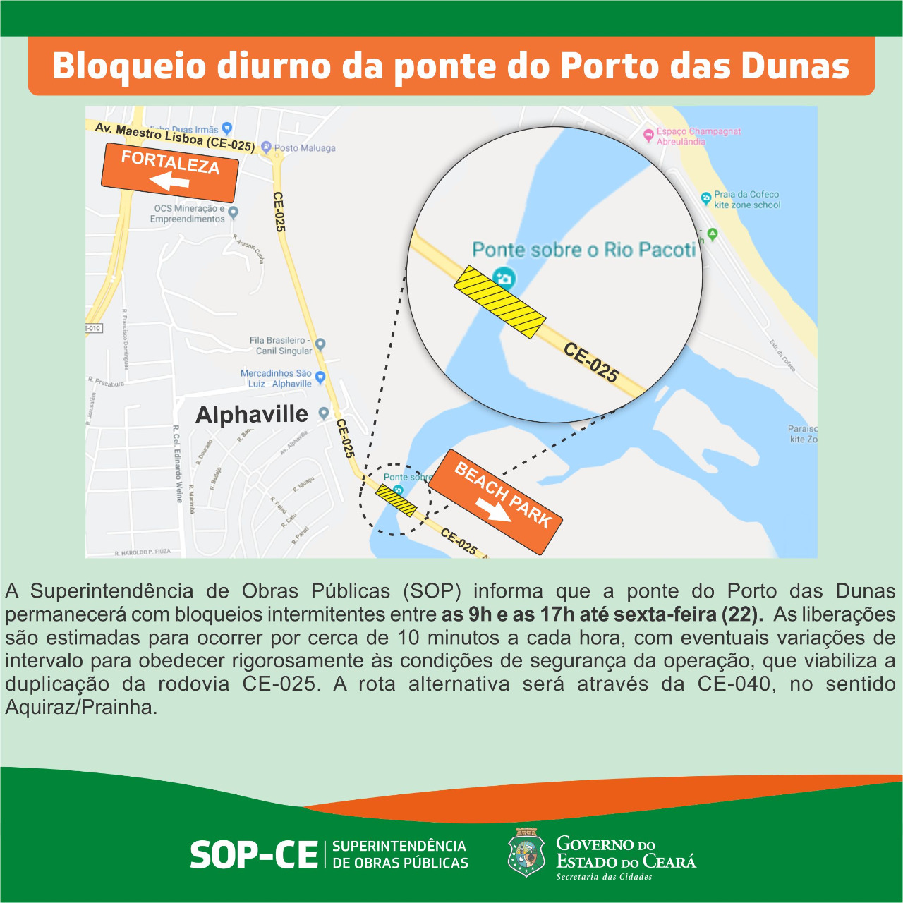 Com o objetivo de dar continuidade à operação, iniciada na terça-feira, de instalação da nova ponte na CE-025, no Porto das Dunas, a Superintendência de Obras Pública (SOP) informa que será necessário permanecer com o bloqueio diurno até esta sexta-feira (22), entre as 9 e as 17 horas. As liberações continuam por cerca de 10 minutos a cada hora, com eventuais variações de intervalo para obedecer rigorosamente às condições de segurança da operação, que envolve guindastes e carretas.