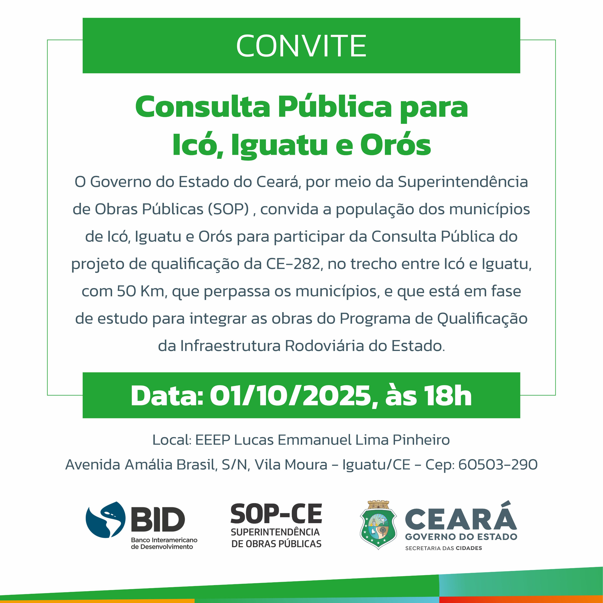 Lista de Notícias Notícias AVISO: Consulta Pública sobre melhorias para CE-282, entre os municípios de Icó, Iguatu e Orós 15 de setembro de 2025 - 14:49 Ascom SOP Voltar ao topo Compartilhar